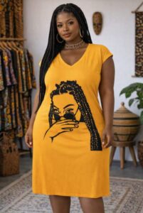 O vestido longo rainha de Kemet é uma homenagem à ancestralidade africana e à força feminina que atravessa o tempo. Sua estampa imponente celebra a realeza negra, o olhar firme e a identidade que não se apaga. Uma peça que envolve o corpo com presença, conforto e significado, pensada para mulheres que caminham com consciência e o3srgulho de sua raízes.